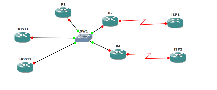 I have taken a simple GNS3 topology,here R1 is serving as Master Controller(MC) the core brain of the OER/Pfr that makes routing decisions the key is there needs to be at least two or more exit points, and R2 and R4 serving as Border Routers(BR) ,here R2 is connected to ISP-1 and R4 is connected to ISP-2 , i have also taken HOST-1 and HOST-2 and disable routing there to see the traffic flow from the hosts perspective.The topology is shown below.