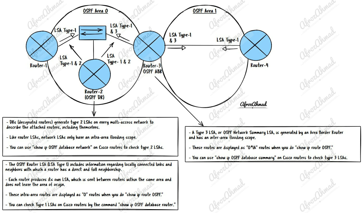 We have discussed different OSPF LSA types in this article, used to share different types of routing information between OSPF-enabled devices. Ensure you understand all the types thoroughly, as the OSPF routing process depends highly on LSA propagation, generation, and reception.